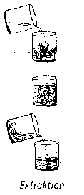 ExtraktionsverfahrenMit Hilfe der Extraktionsverfahren werden lösliche Bestandteile z.B. aus pflanzlichem Material herausgelöst. Reste des Pflanzenmaterials bleiben zurück. Die Extraktionsverfahren sind sehr zahlreich. Bekannt sind die Techniken, die zur Herstellung von Tinkturen angewandt werden; es handelt sich in erster Linie um Mazerationen frischer Pflanzenteile oder Drogen. Extraktionen werden mit oder ohne Wärme durchgeführt. Ein Verfahren, bei dem Wärme angewandt wird, ist die sog. Soxhlet-Extraktion. Fermentative VerfahrenHierbei handelt es sich in erster Linie um die bekannten ethanolischen und milchsauren Gärungen. DestillationsverfahrenDie einfache Destillation ist bekannt. Die Kohobation ist eine Mehrfachdestillation, bei der das Destillat immer wieder auf den Rückstand in den Destillationskolben zurückgegeben und dann wieder abdestilliert wird.